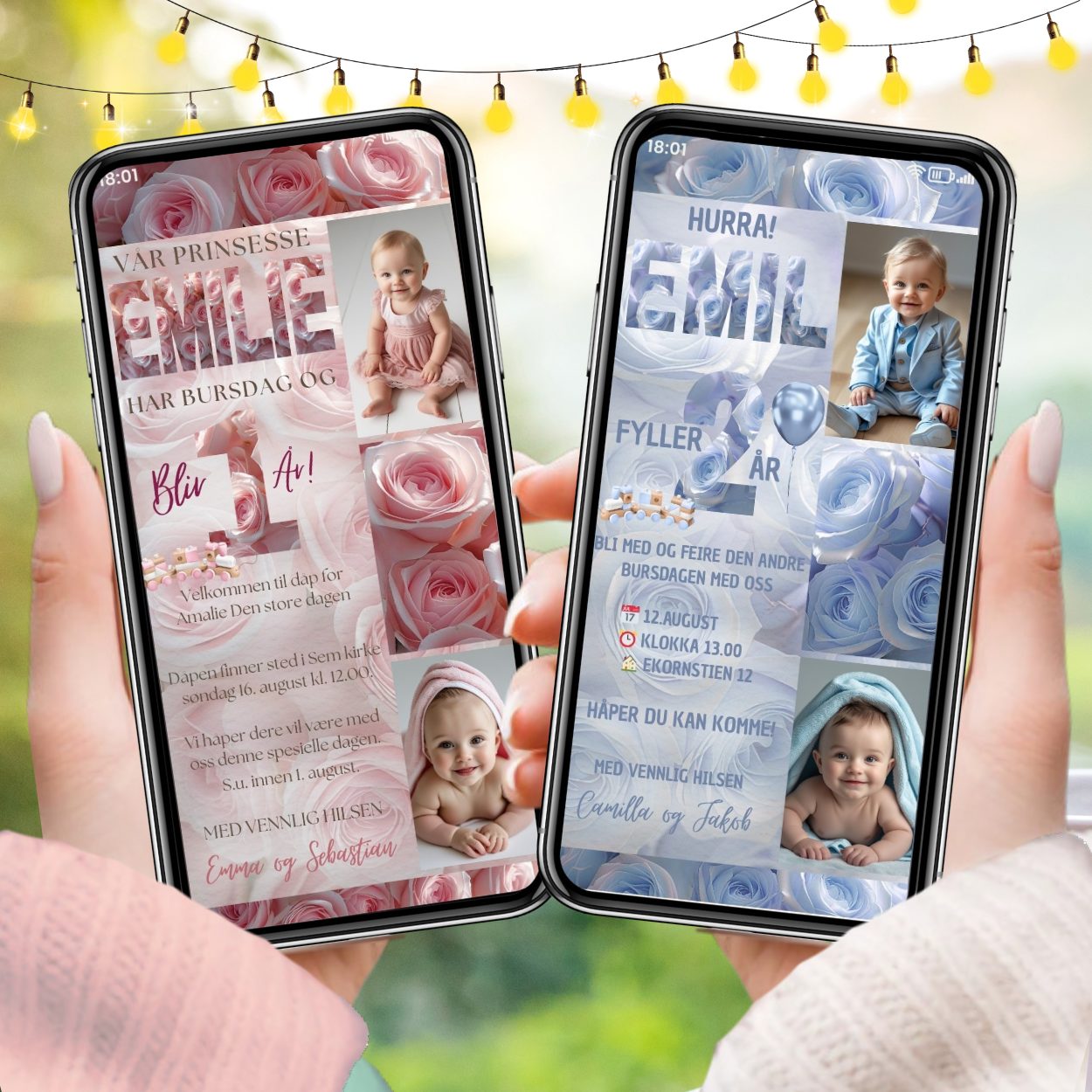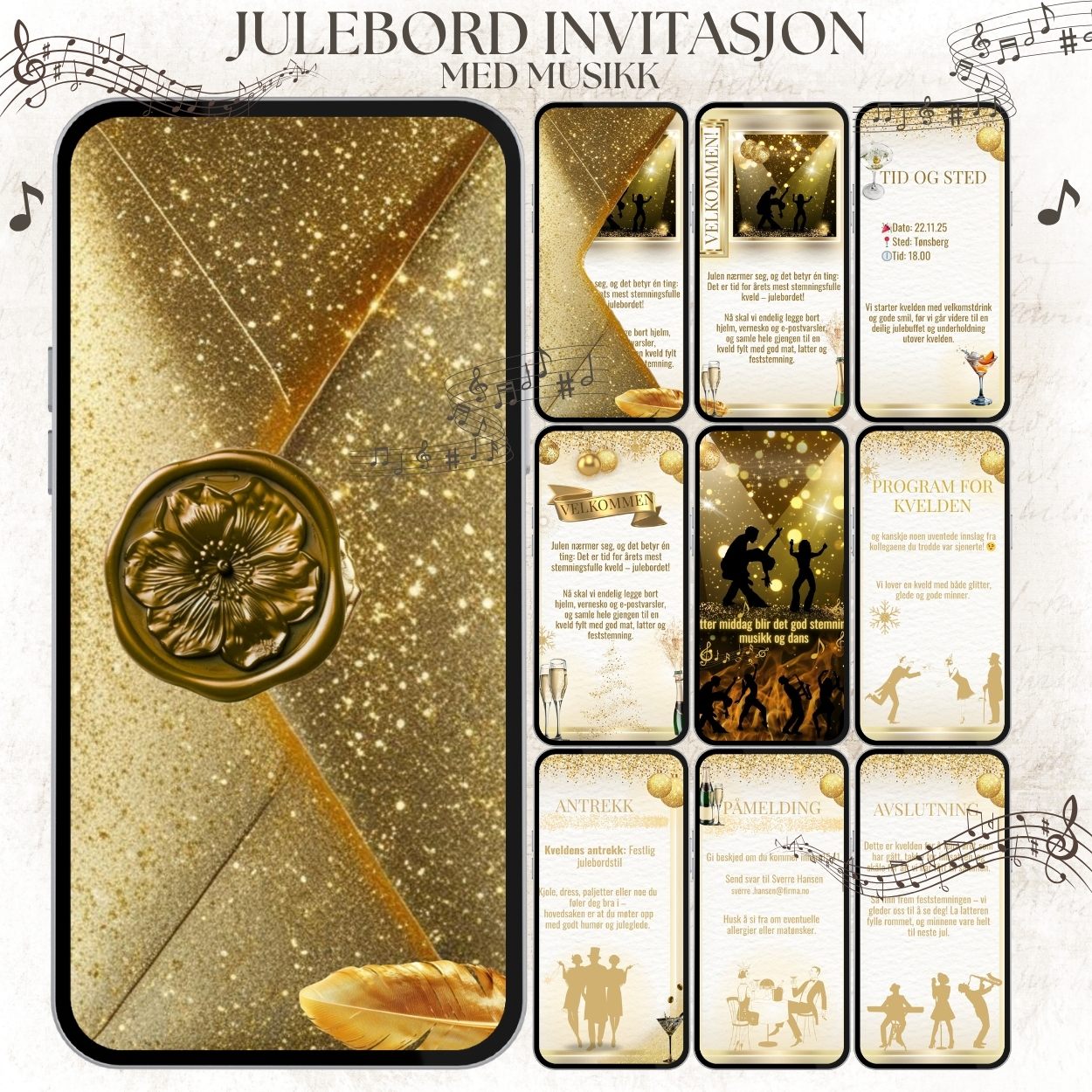 Her finner du invitasjoner, takkekort, menyer, bordkort, prislister, logo og mer – perfekt til bryllup, dåp, konfirmasjon, bursdag, babyshower eller andre anledninger. Alle design sendes digitalt, rett til gjestenes mobil, med mulighet for en helhetlig stil på alle elementer.