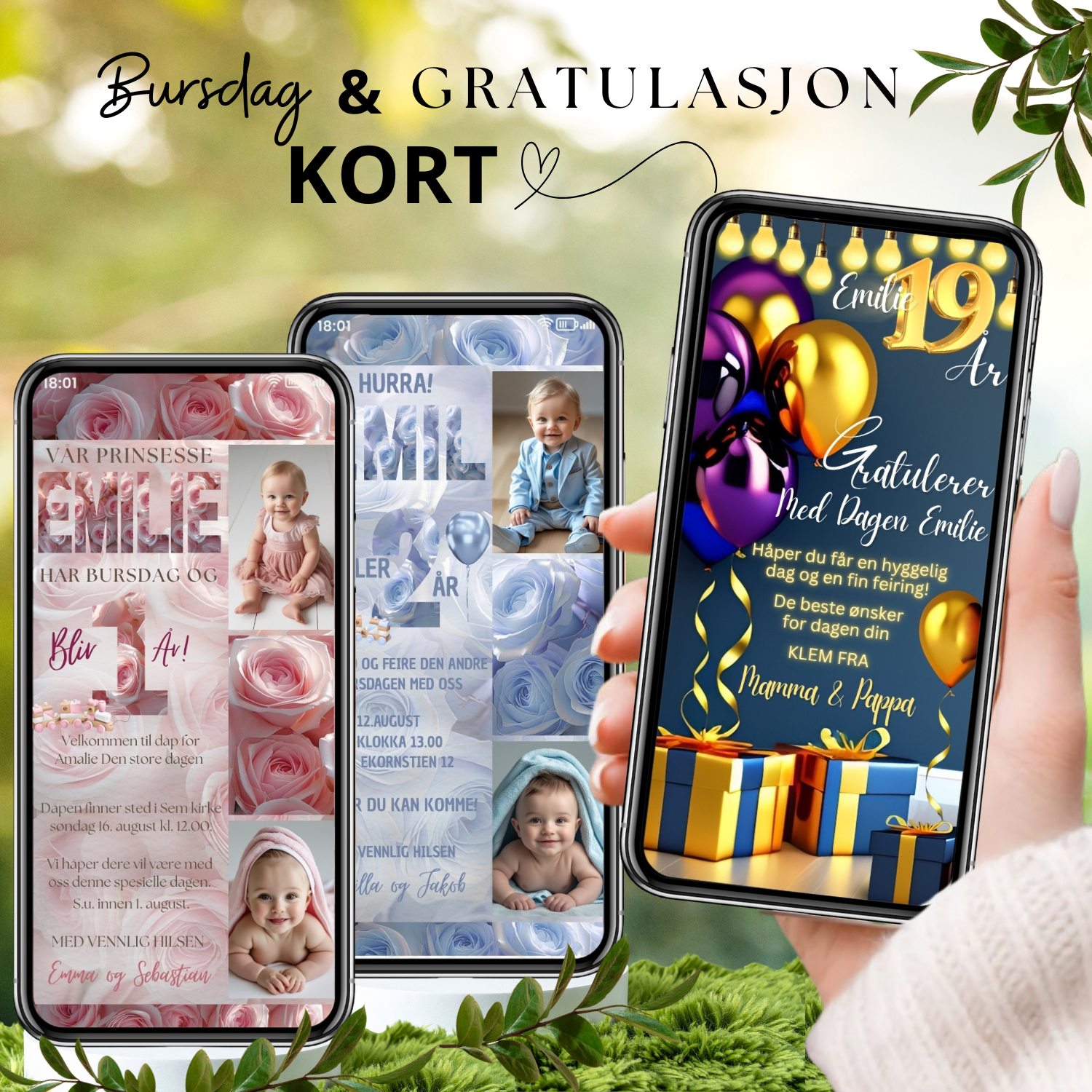 Bursdagsinvitasjon: Send bursdagsinvitasjon fra din mobilen direkte til alle gjestene. Dette er et digitalt kort - som betyr: Ingen venting på at kortet kommer i posten! Må ikke bestille store kvanta Produktet er tilgjengelig senest innen èn virkedag. Hva får du: Dette kjøpet inkluderer 1 PDF-fil. Bursdagsinvitasjon i valgt størrelse, med tekst og design. Behandlingstid: Produktet vil være tilgjengelige for deg senest innen èn virkedag. Vi sender deg først en forhåndsvisning for godkjenning, når den er godkjent vil den bli ferdigstilt og sendt til deg. Behandlingen av ordren vil starte når all informasjon er sendt inn til KISS DEKOR OBS:  Husk å sende inn tekst og år. Sørg for at du kontrollerer all tekst og grammatikk før bestilling. KISS DEKOR kan ikke holdes ansvarlige for eventuelle skrivefeil. All tekst må sendes inn i Word-format.