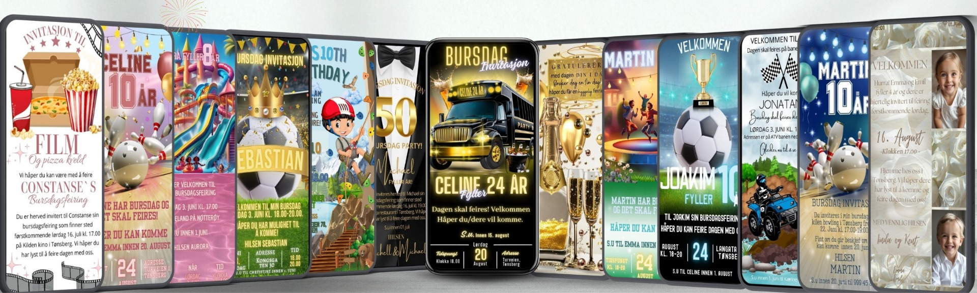 Hos KISS DEKOR finner du et bredt utvalg ferdig designede bursdagsinvitasjoner – klare til å tilpasses og sendes digitalt rett til gjestenes mobil.
