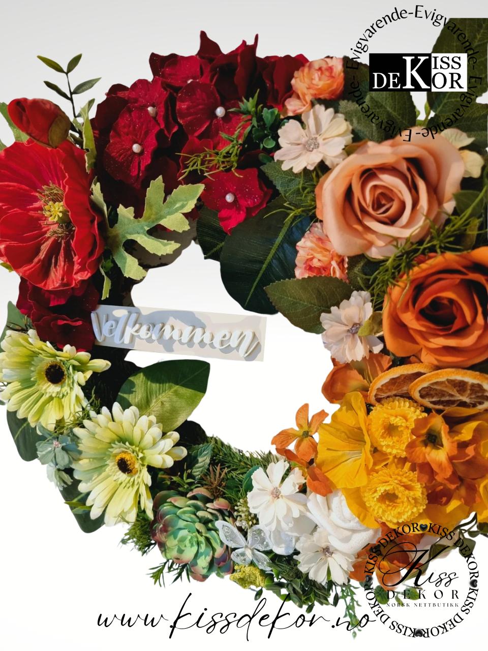 The flower wreath is filled with beautiful summer flowers such as: Roses in different colors, red poppies, gerbera, daisy branch, hydrangea, monstera leaf, cactus, ficus, ipomea, boxwood, lots of greenery and more refreshing flowers. The wreath is decorated with orange slices, pearls, butterfly and welcome sign. The welcome writing is white, attached to an aluminum sign. This is a solid product with exclusive materials to be able to offer customers the most everlasting product of high quality. Size: H:54 cm L: 50 cm (Ø 52) Weight : 0.91 kg Color: Green, orange, red and white