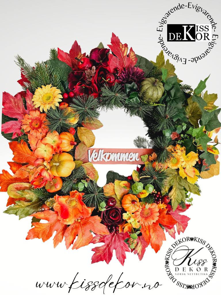 Colorful, warm autumn wreath decorated in red, yellow, orange, brown and green. The autumn wreath contains: Morels, small berries, flowers, autumn leaves, mushrooms, pumpkins and decorations in autumn colours. The suspension for the wreath is silk ribbon in a lovely orange colour. The ribbon is attached to a ring for perfect suspension. Sign in aluminium, with the text: Welcome, is attached. Height w/decoration: 39 cm Height w/band: 49 cm Colour: Green, yellow, orange, brown and red #Eternal #Autumn wreath #Artificial wreath