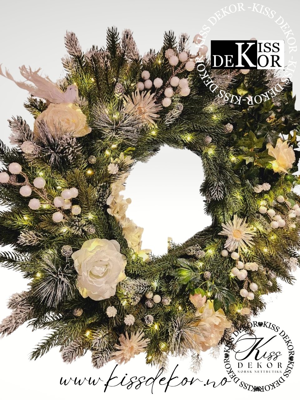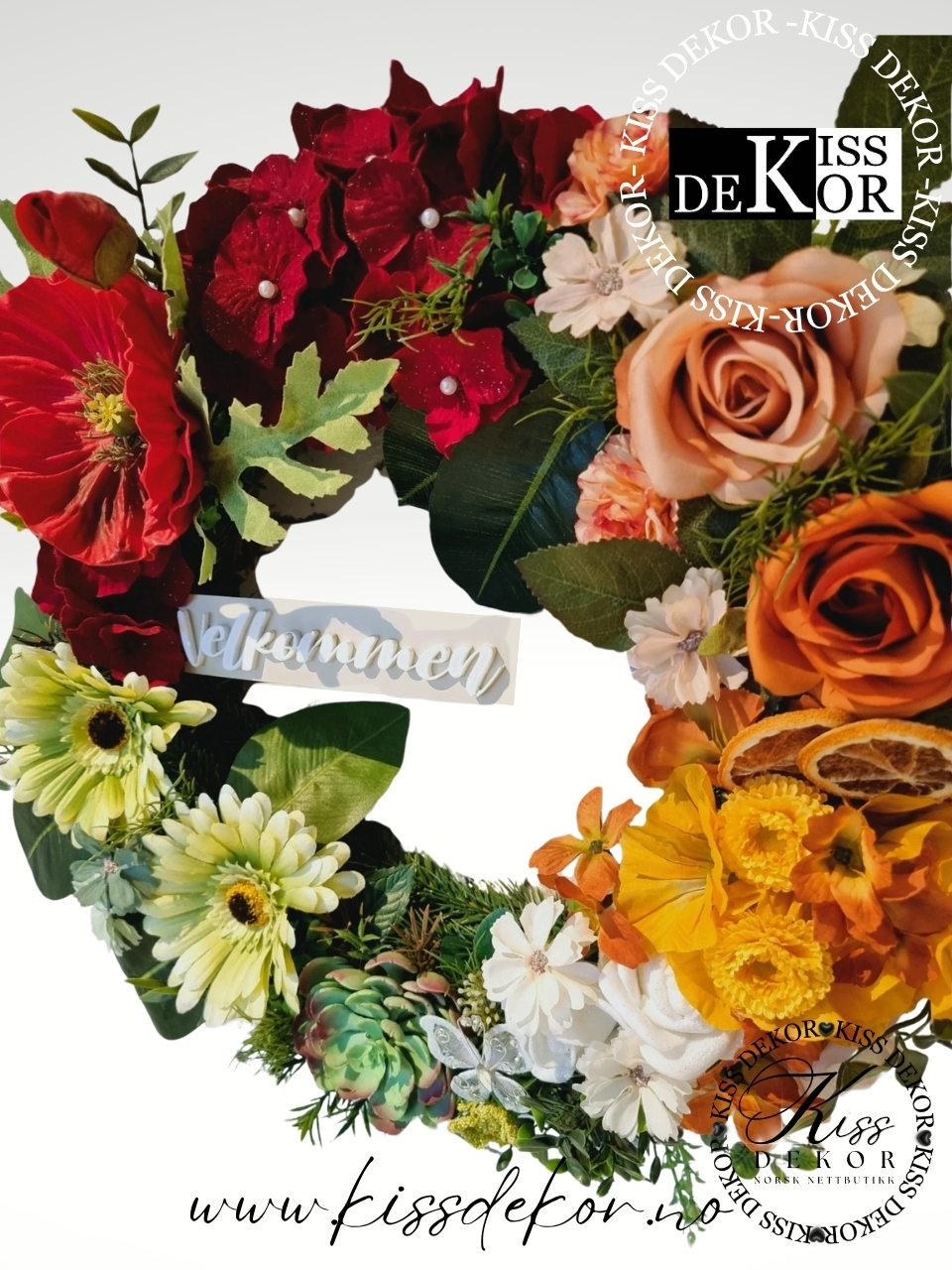 Oppdag magien i vår håndlagde evigvarende vårkrans , en eksplosjon av naturens mest forførende nyanser som bringer vårens varme inn i hjemmet ditt – året rundt! Denne nydelige kransen er et mesterverk av kunstferdig håndverk, der hver blomst og blad er nøye valgt for å skape en symfoni av farger og former som fanger blikket og varmer sjelen. Med en omkrets på ca. 80 cm m/pynt er den ideell for å pynte ytterdøren, stueveggen eller som et statement-stykke over spisebordet – stor nok til å gjøre inntrykk, men elegant nok til å passe inn overalt. Ranunkler (Ranunculus) i dype rosa og koralltoner, med sine fyldige, lagdelte kronblad som utstråler romantikk og eleganse. Magnolia i ren, kremhvit glans – en tidløs klassiker som symboliserer renhet og fornyelse, med myke kanter som inviterer til berøring. Dahliaer i levende gult og oransje, fyldige og solfylte, som sprer glede og energi som en solstråle på en grå dag. Peonier (Paeonia) i mykt rosa, med sine luftige, voluminøse blomster som oser av luksus og femininitet. Hortensiaer (Hydrangea ) i lilla og blå nyanser, fluffy og drømmeaktige, som tilfører en touch av mystikk og dybde. Rosenknopper i klassisk rødt og hvitt, delikate og tidløse, som hvisker kjærlighet og varighet. Margueritter (Daisies) og små hvite blomster for den friske, villblomstede charmen – en påminnelse om en solfylt eng. Og så klart, de grønne eføybladene (Ivy) som vever seg inn som en naturlig ramme, sammen med dekorative elementer som bringebærtoner og små påskeliljer (Narcissus) for ekstra vårfølelse.