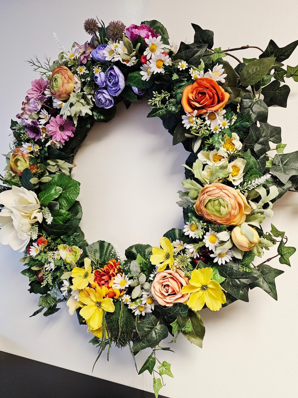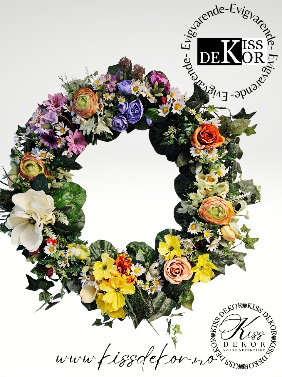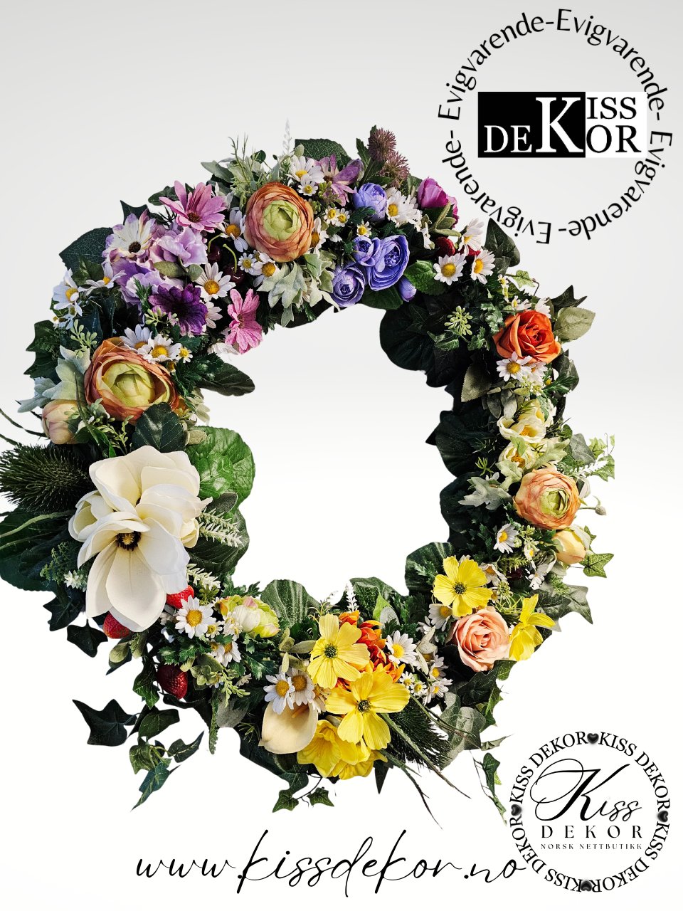 Oppdag magien i vår håndlagde evigvarende vårkrans, en eksplosjon av naturens mest forførende nyanser som bringer vårens varme inn i hjemmet ditt – året rundt! Denne nydelige kransen er et mesterverk av kunstferdig håndverk, der hver blomst og blad er nøye valgt for å skape en symfoni av farger og former som fanger blikket og varmer sjelen. Med en omkrets på ca. 80 cm m/pynt er den ideell for å pynte ytterdøren, stueveggen eller som et statement-stykke over spisebordet – stor nok til å gjøre inntrykk, men elegant nok til å passe inn overalt.