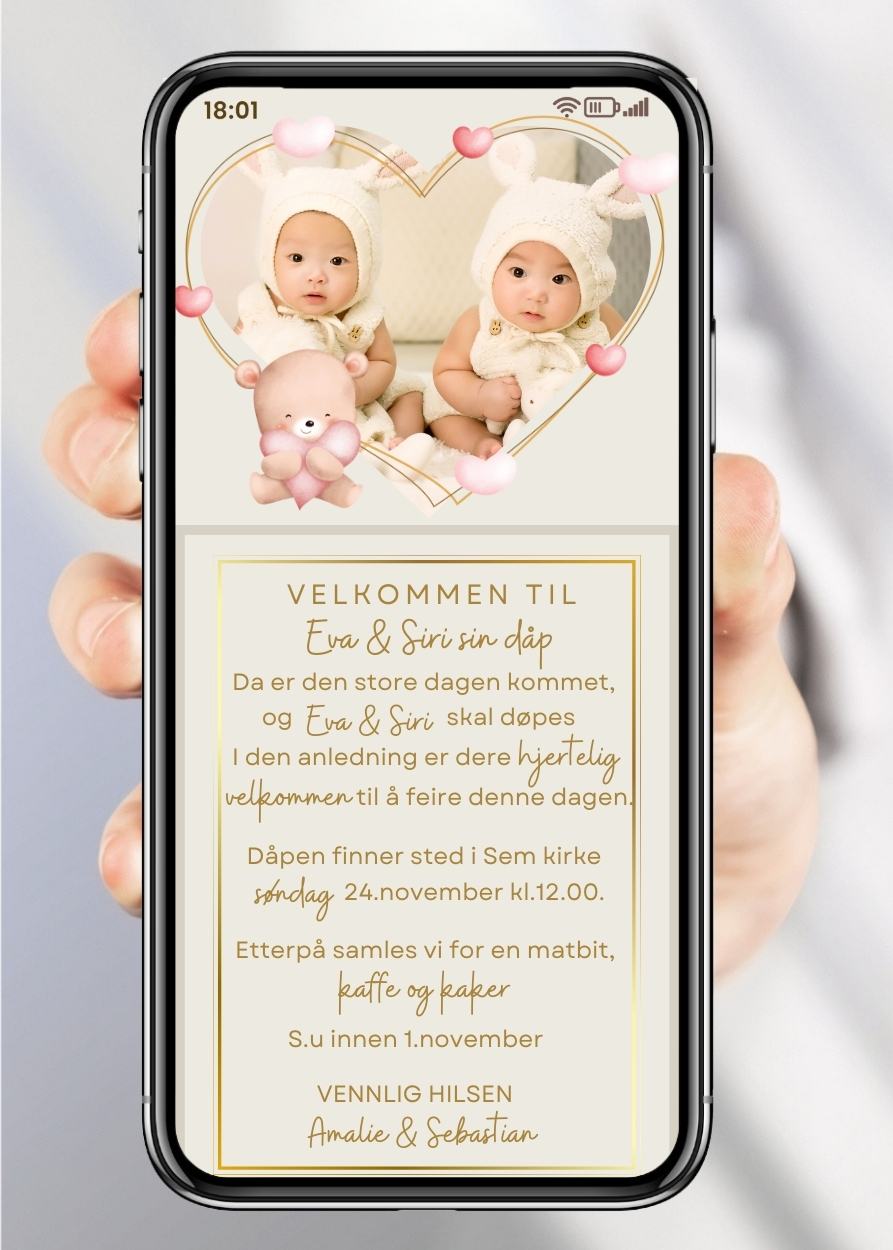 • Invitasjon i valgt størrelse og design med egen tekst og bilde.