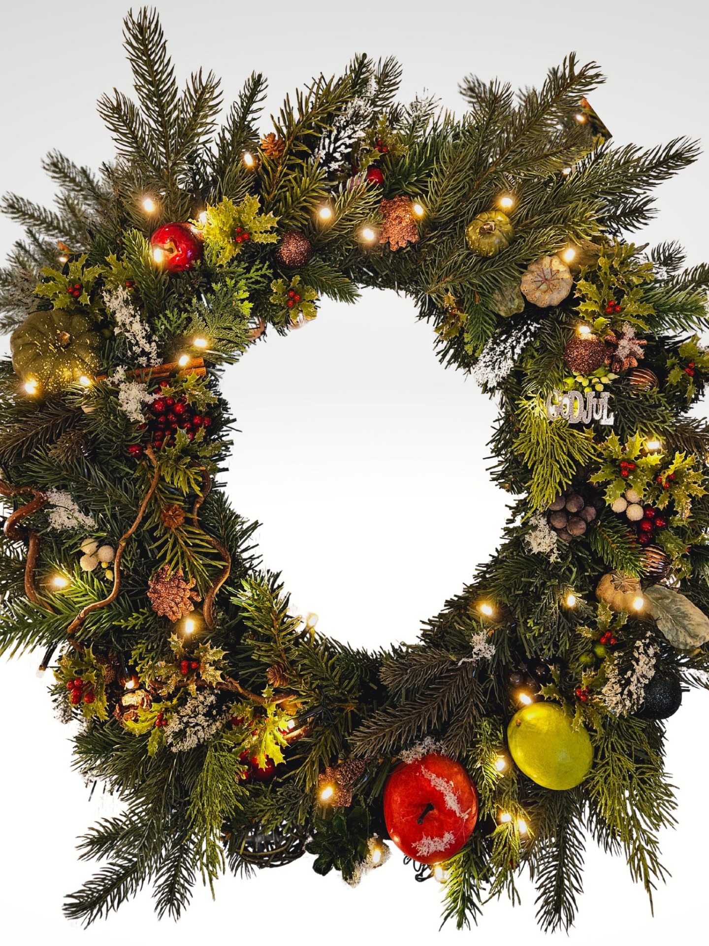 Vakker krans med pynt som assosieres med julen. Den passer godt i de aller fleste miljøer. Den kan henges på døren eller den er vakker som en dekorasjon på bordet. Kunstig og evigvarende og kan tas frem like frisk og vakker år etter år. Allergivennlig og velegnet i områder hvor det er viktig å ta hensyn til allergier og personer med lavt immunforsvar.
