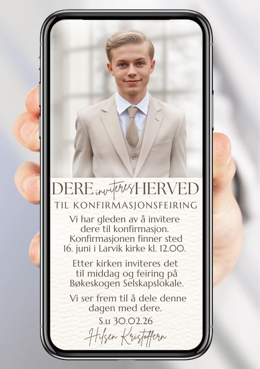 Ved kjøp kan ønsket tekst i invitasjonen legges ved under <tilleggsinformasjon> etter betaling. Du kan også sende inn ønsket tekst på e-post til kissdekor@outlook.com sammen med ditt personlige bilde.