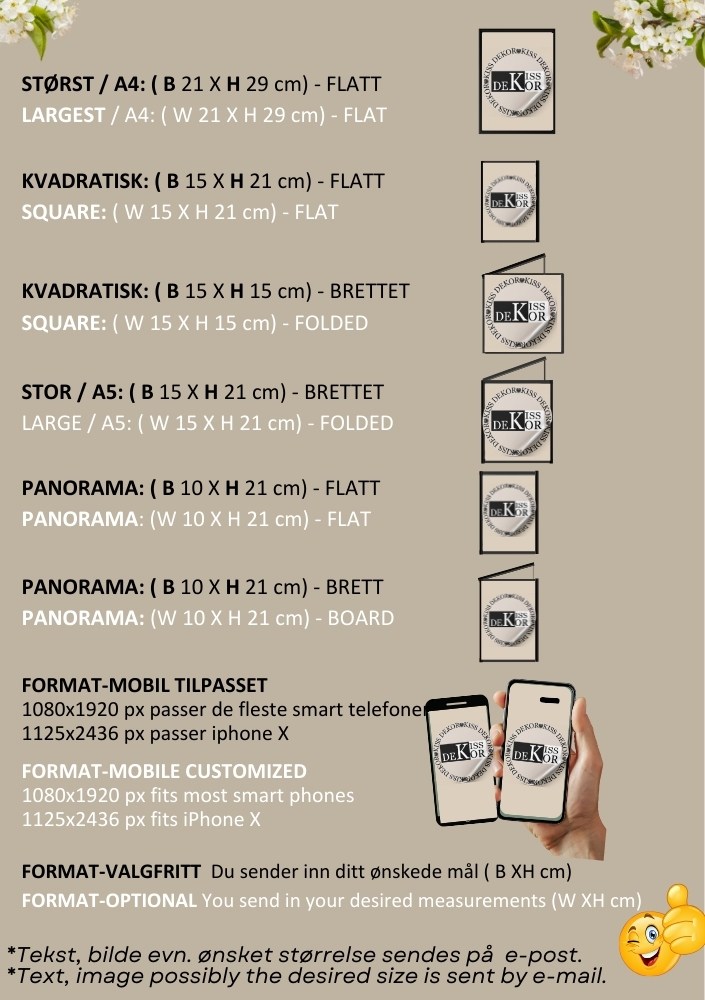 Processing time: The product will be available to you no later than one business day. We will first send you a preview for approval, once it is approved it will be completed and sent to you. Processing of the order will start when all information has been submitted to KISS DEKOR
